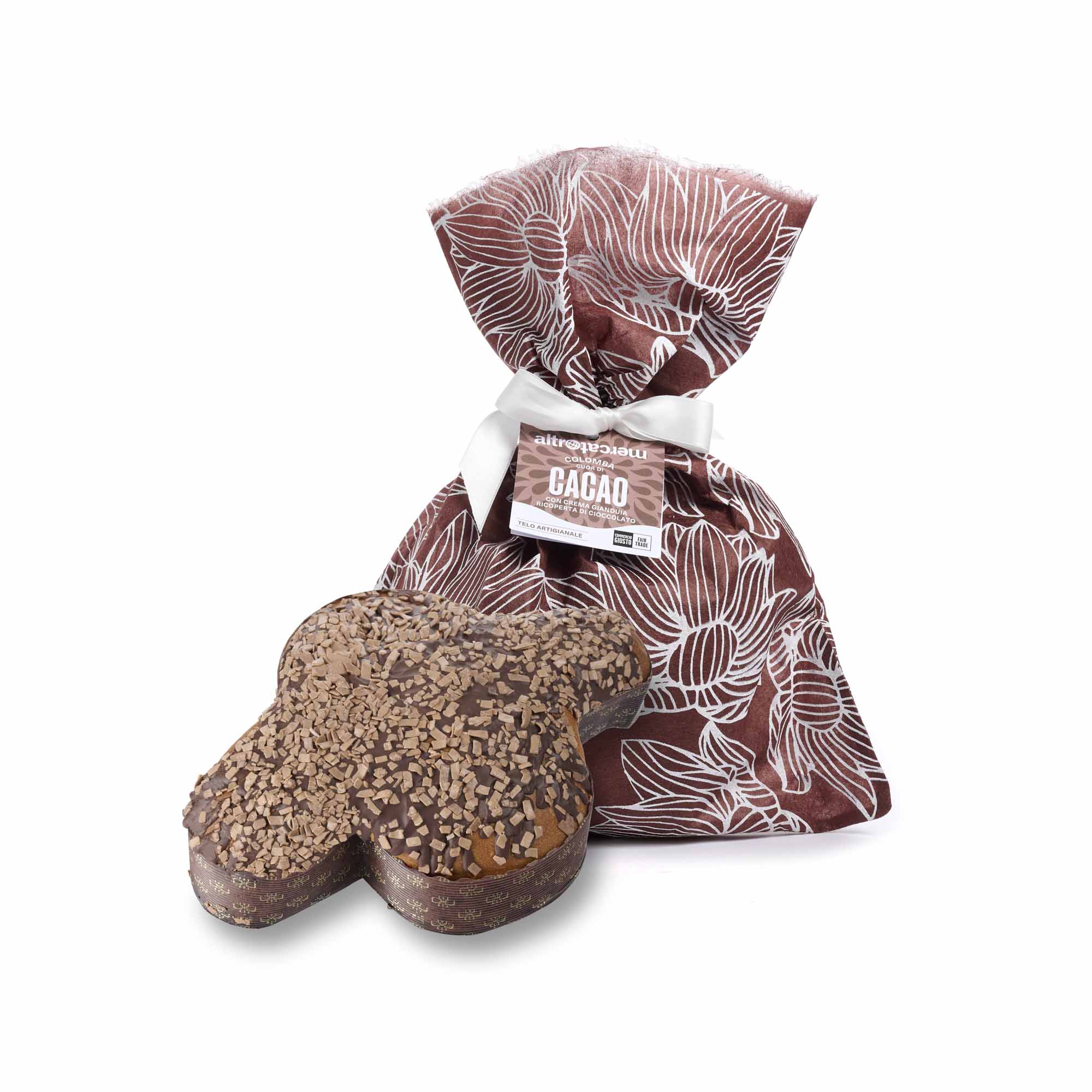 Paloma Cuor di Cacao è la nostra soffice colomba dal cuore buono per tutti: farcita con una deliziosa crema alla gianduia, è avvolta da una copertura di cioccolato fondente e decorata con cioccolato al latte. Anche la confezione è speciale: in carta seta realizzata a mano dalle artigiane di Prokritee, in Bangladesh. Potrai divertirti a riutilizzarla nel rispetto delle persone e del pianeta